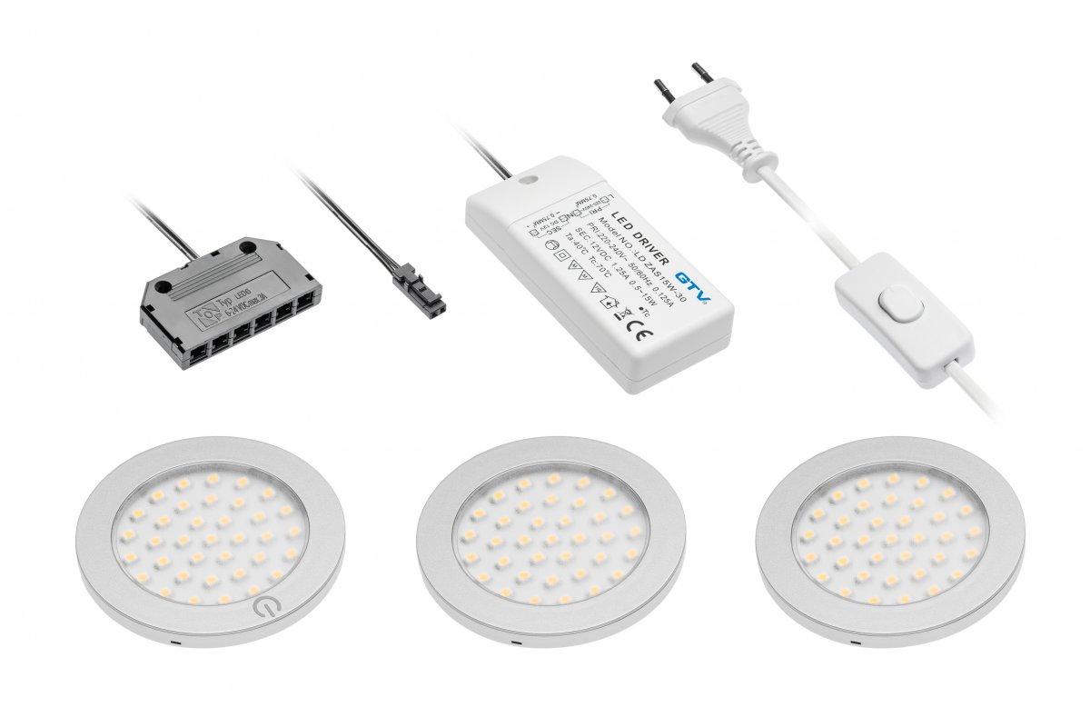 A set includes three fittings and all necessary accessories needed for proper operation (a LED driver, distributor, power cable). There is no need to connect an additional switch because it is built into the fitting.