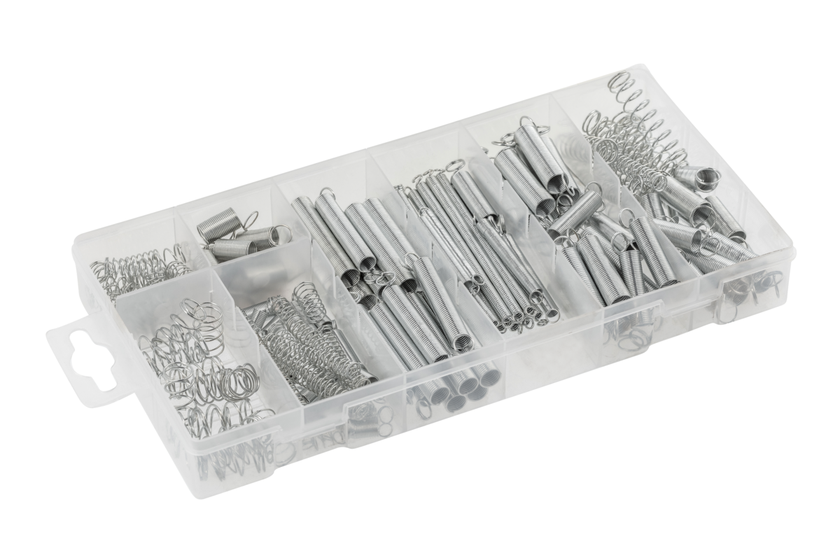 A set of steel springs with a wide range of applications in the household, workshop, automotive and service industries.