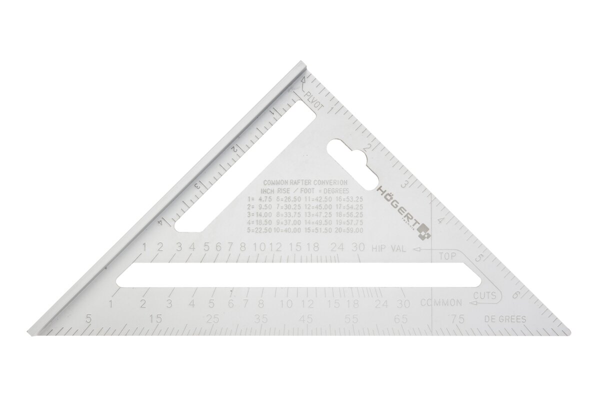 Roofing square used in the construction of wooden roof structures and other carpentry work. It has designations that facilitate, among others, cutting rafters in rafter framing. Also useful when outlining parallel lines, which makes it an ideal tool for other standard carpentry work. This tool can be used to set angles in mitre saws. Intended for professional applications.