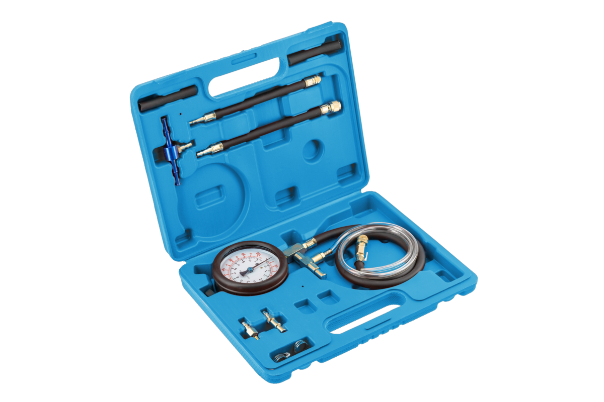 Pressure tester allows for precise measurement of fuel injection in the cylinders of gasoline and diesel engines. A legible, dual scale of manometer makes reading of the measurement result easy. The indicator is made of damage-resistant and lightweight materials. In addition, the indicator glass is enclosed by a rubber, shock-absorbing cover. The parts are equipped with quick couplings for easy and quick installation. Tester is mainly used in automotive services.