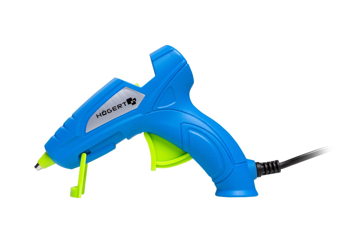 Hot glue gun – gluing, among others wood, textiles, foil, paper, cardboard, plastics, ceramics, leather, etc. It glues materials that can be exposed to temperature above 70°.