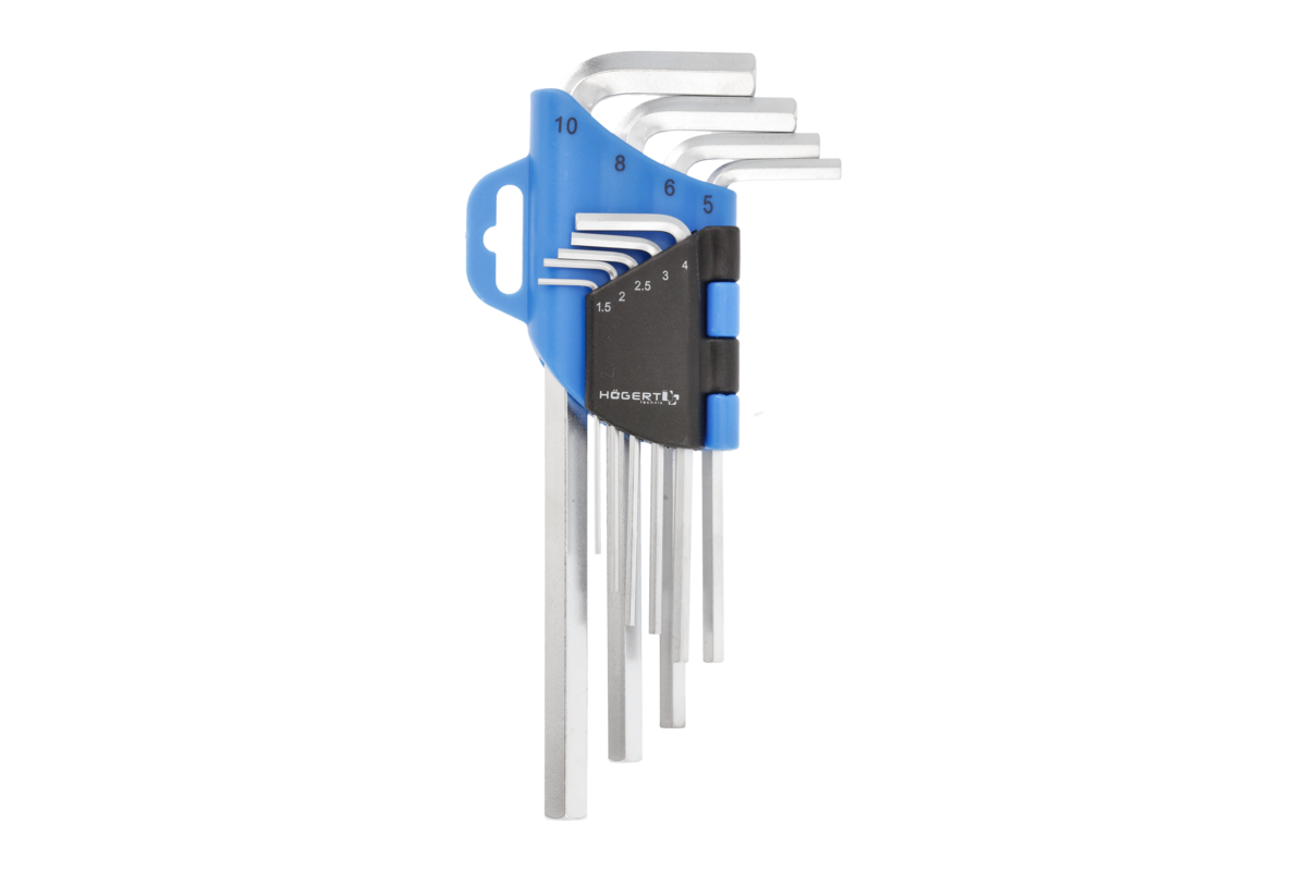 9-piece precision hexagonal long wrench set designed for loosening and tightening screws in narrow spaces. A must-have with any workshop, renovation and construction works and in every household.