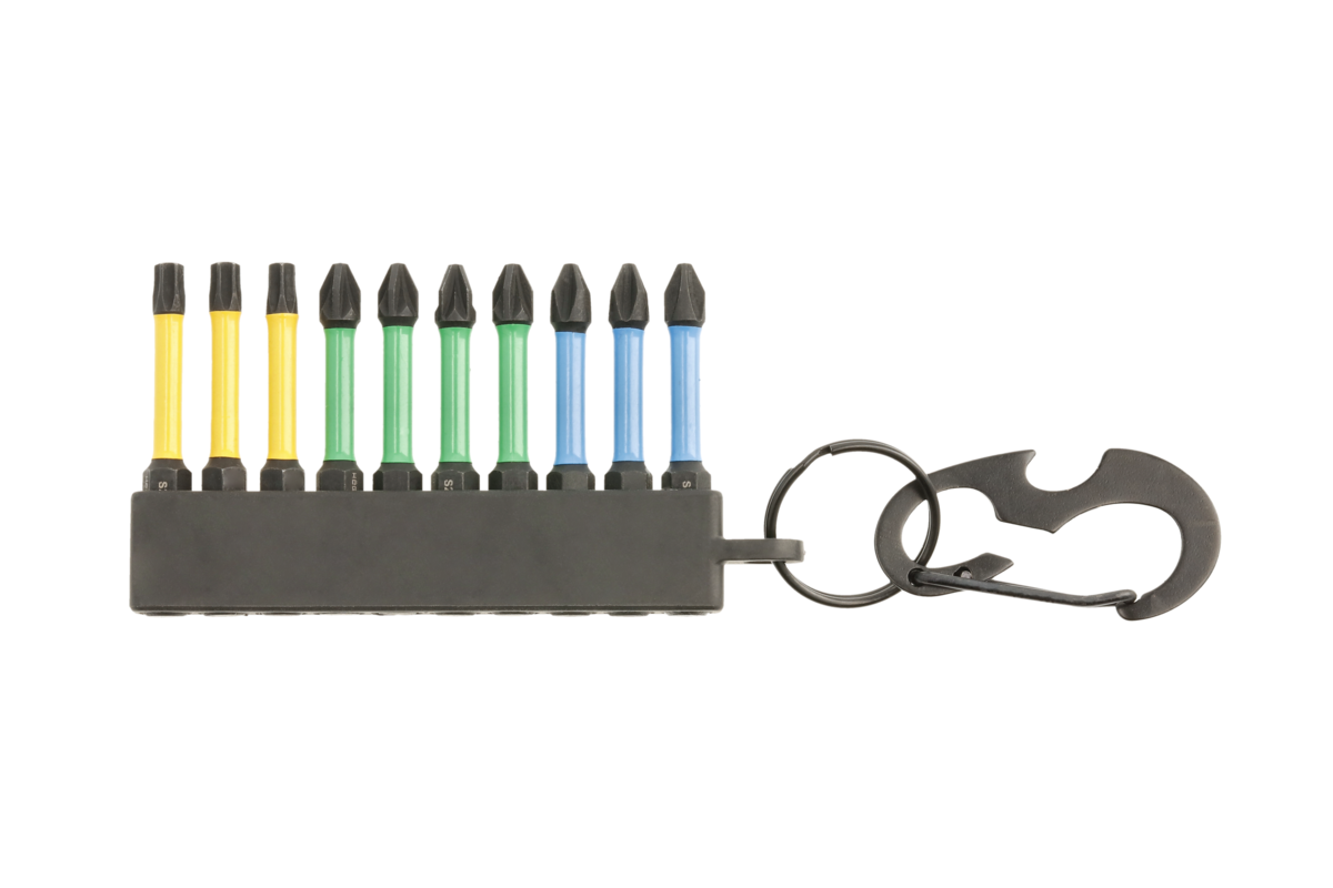 Practical packaging with an additional hook (carabiner) makes it easier to store and carry the bits.