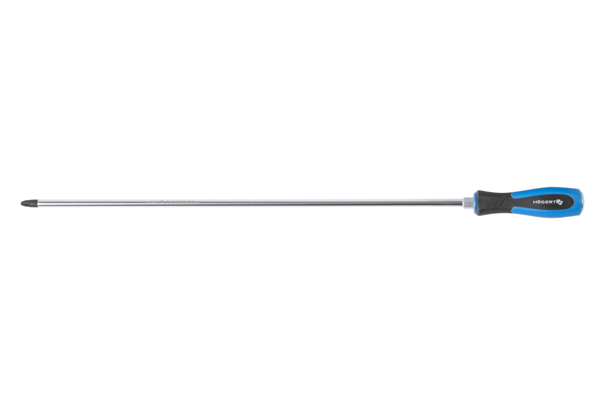 This long cross-head screwdriver, 45 centimeters in length, is an excellent tool for working with screws located in hard-to-reach and distant places. It is made of durable, deformation-resistant chrome-vanadium alloy steel with a hardened tip. Its magnetization facilitates and speeds up work with screws, especially those placed in areas inaccessible to fingers. The ergonomic handle design ensures comfort in use with minimal effort. The anti-slip surface facilitates precise work and allows for full force transfer to the screw. The special design allows working with stubborn nuts and screws by the possibility of hammering or increasing the unscrewing force using a flat wrench.