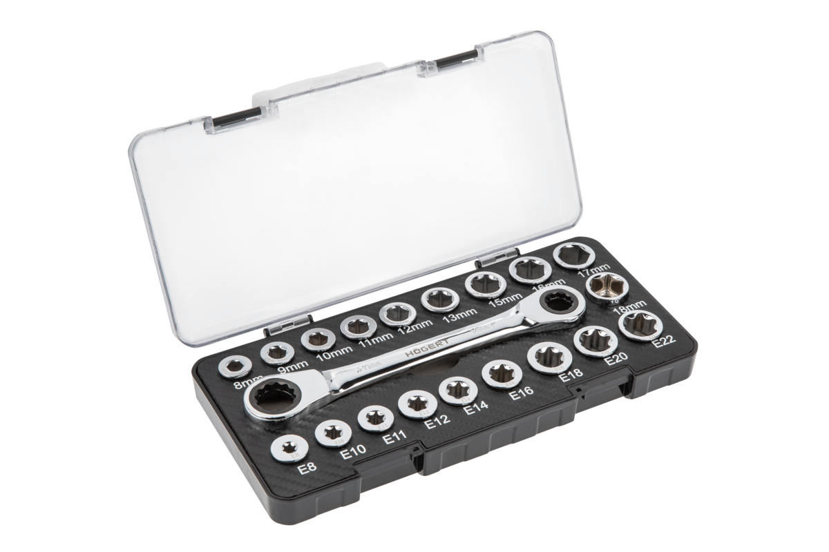 A ratchet spanner with a set of sockets is used to unscrew and tighten threaded joints with a hexagonal fixing element and a TORX. Thanks to the ratchet, there is no need to take the spanner off the nut to make another turn, whilst the sockets allow for work with screws of various sizes. The 20-piece set makes it possible to work in the range from 8 to 19 mm / E8 – E22 mm. The universal application of the spanner allows for its usage both in the workshop, as well as in renovation, construction and installation works.