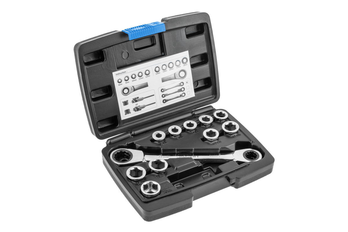 A ratchet spanner with a set of sockets is used to unscrew and tighten threaded joints with a hexagonal fixing element. Thanks to the ratchet, there is no need to take the spanner off the nut to make another turn, whilst the sockets allow for work with screws of various sizes. The 11-piece set makes it possible to get a full set of spanners in sizes 8 – 19 mm. The universal application of the spanner allows for its usage both in the workshop, as well as in renovation, construction and installation works.
