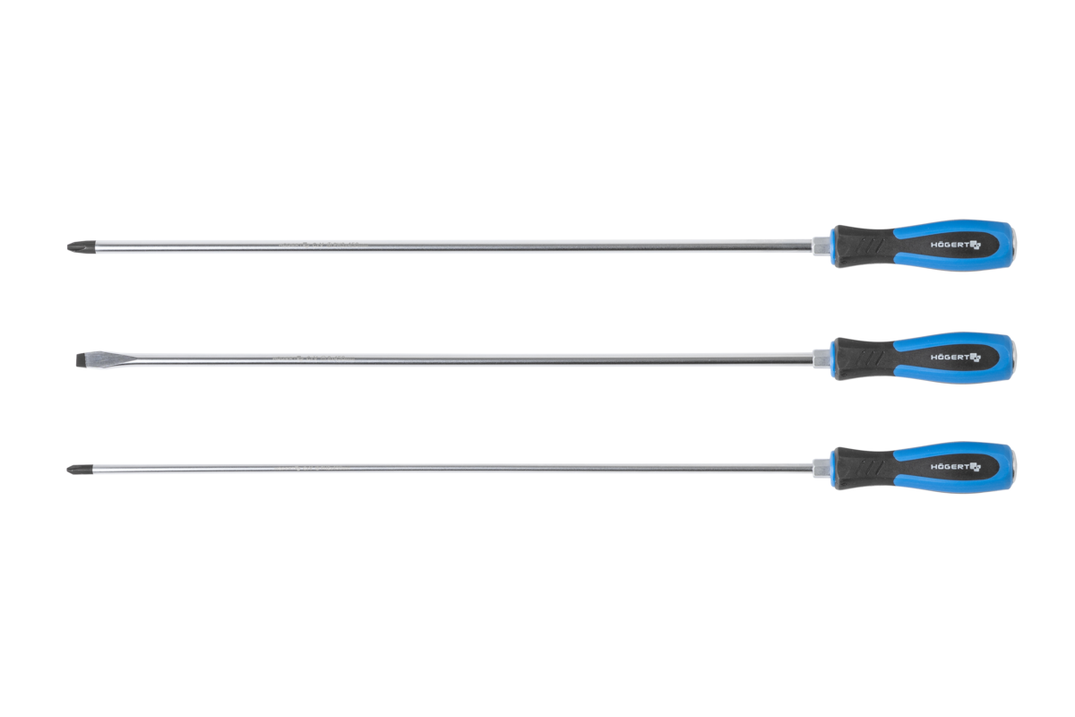 This set of three long cross-head and flat screwdrivers, each 45 centimeters in length, is an excellent tool for working with screws located in hard-to-reach and distant places. The screwdrivers are made of durable, deformation-resistant chrome-vanadium alloy steel with hardened tips. Their magnetization facilitates and speeds up work with screws, especially those placed in areas inaccessible to fingers. The ergonomic handle design ensures comfort in use with minimal effort. The anti-slip surfaces facilitate precise work and allow for full force transfer to the screws. The special design allows working with stubborn nuts and screws by the possibility of hammering or increasing the unscrewing force using a flat wrench.