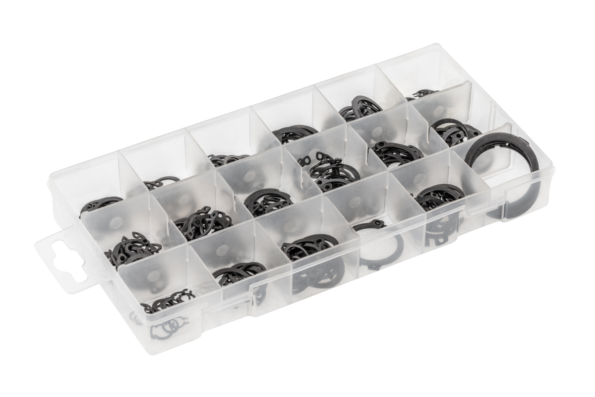 Snap rings (Seeger E-CLIP). Used for locking and securing against slipping. Essential in automotive workshops and repair shops.