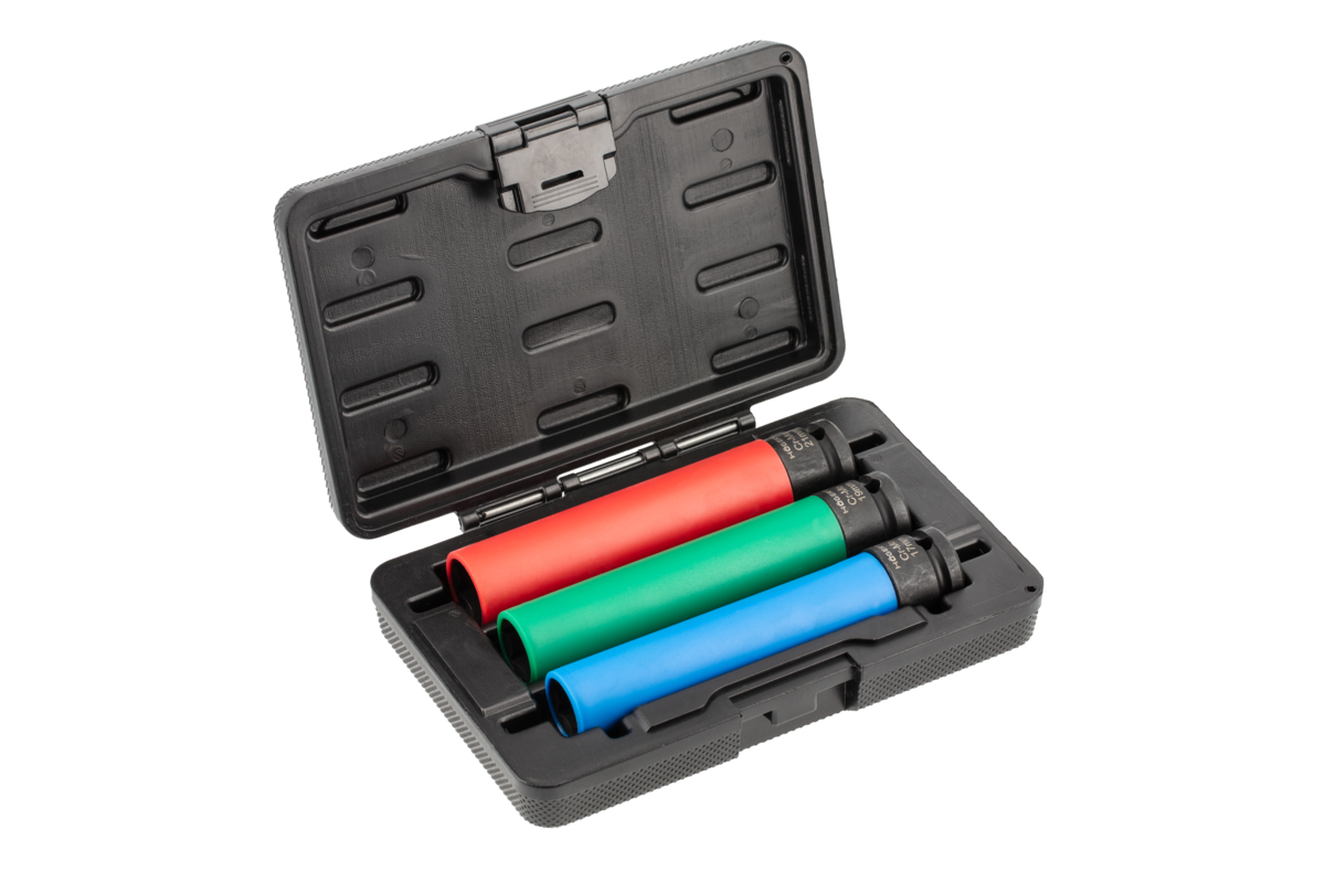 Set of long 1/2" impact sockets for aluminum rims. The set includes popular sizes 17 mm, 19 mm, 21 mm.