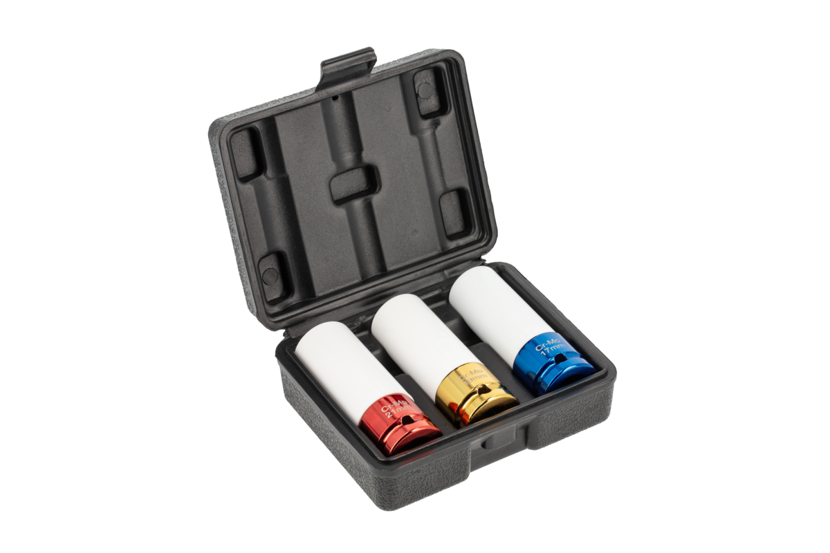 Set of 1/2" impact sockets for aluminum rims. The set includes popular sizes 17 mm, 19 mm, 21 mm.