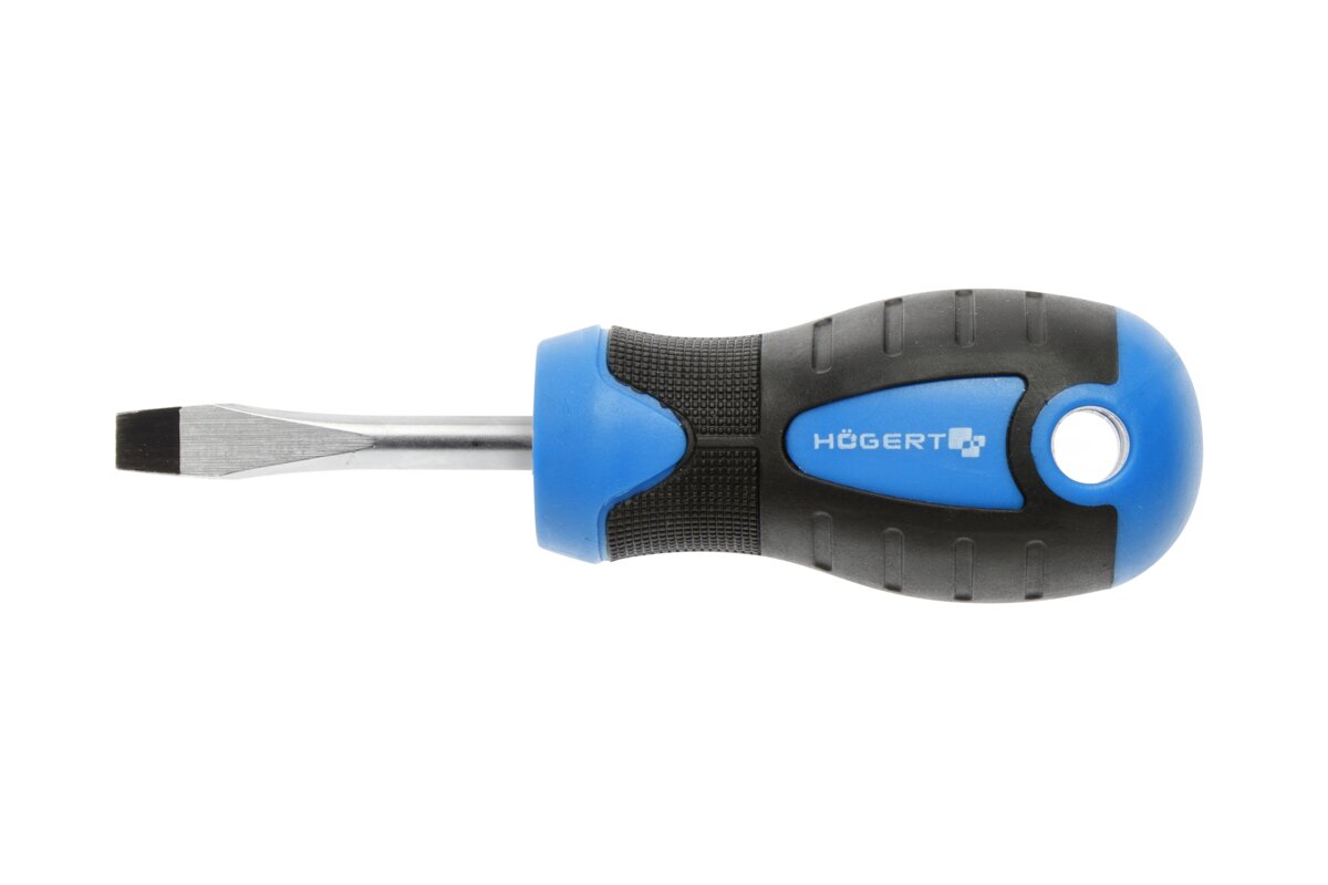 Screwdrivers for slotted screws. Have a single slot in the fastener head. Ground on both sides with a parallel converging profile.Characteristics• made of high quality S2 steel• durable and deformation resistant• the magnetic tip increasing work precision and comfort• bi-material handle with specially formed anti-slip surface for high speed torque transfer