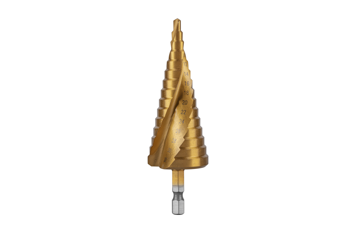 Step spiral drill bit adapted for drilling in various types of steel, non-ferrous metals, plastics and wood. It enables drilling precise holes. The drill bit has spiral cutting grooves, which are one of the most effective technologies used in step drill bits and which enable much quicker and more effective drilling of holes, the edges of which remain precisely deburred. It can be used in tinsmith services, car workshops or in installers and electricians work. For professional use.