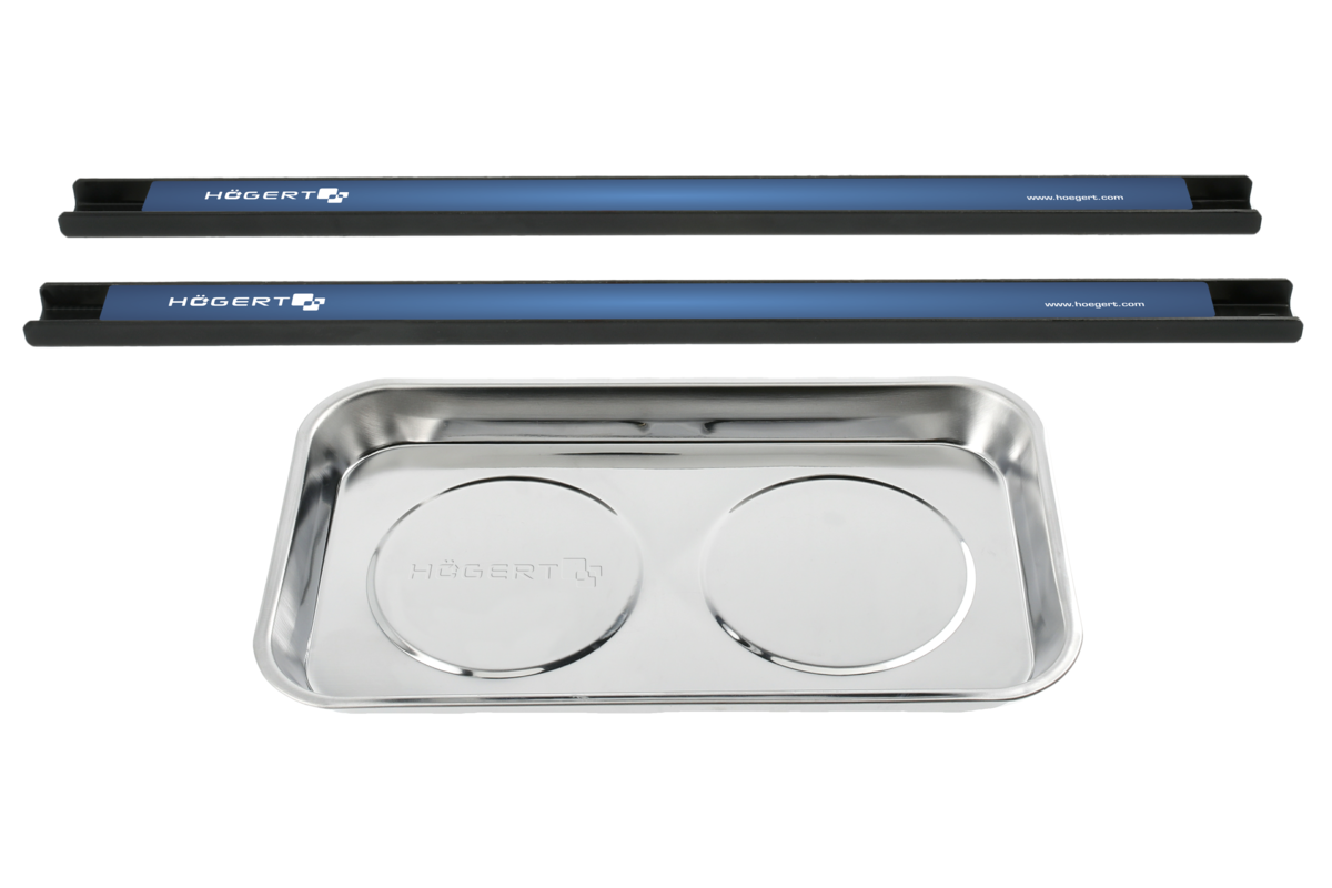 A set of two magnetic strips for hanging tools and bowls for storing small parts. The strips are suitable for hanging frequently used tools such as screwdrivers, spanners, bits, clamps. The bowl can be attached to a car or a workshop cabinet, a column jack and a variety of metal parts such as screws, washers, springs, rings, etc. can be placed in it. The set is useful in every workshop.