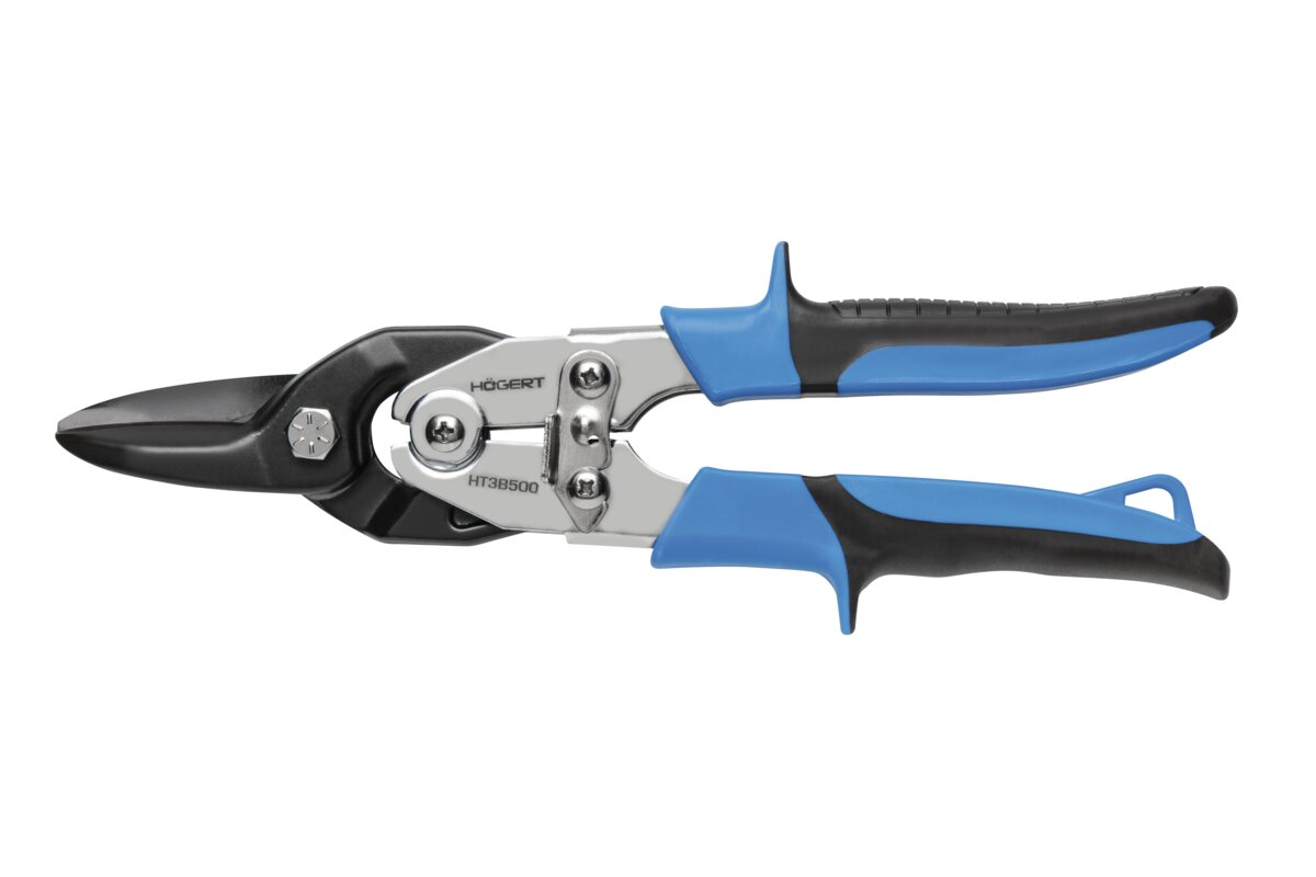 Aviation tin snips for cutting sheets of up to 1.5 mm, in steel, aluminium, plastic, wire mesh, and similar materials.