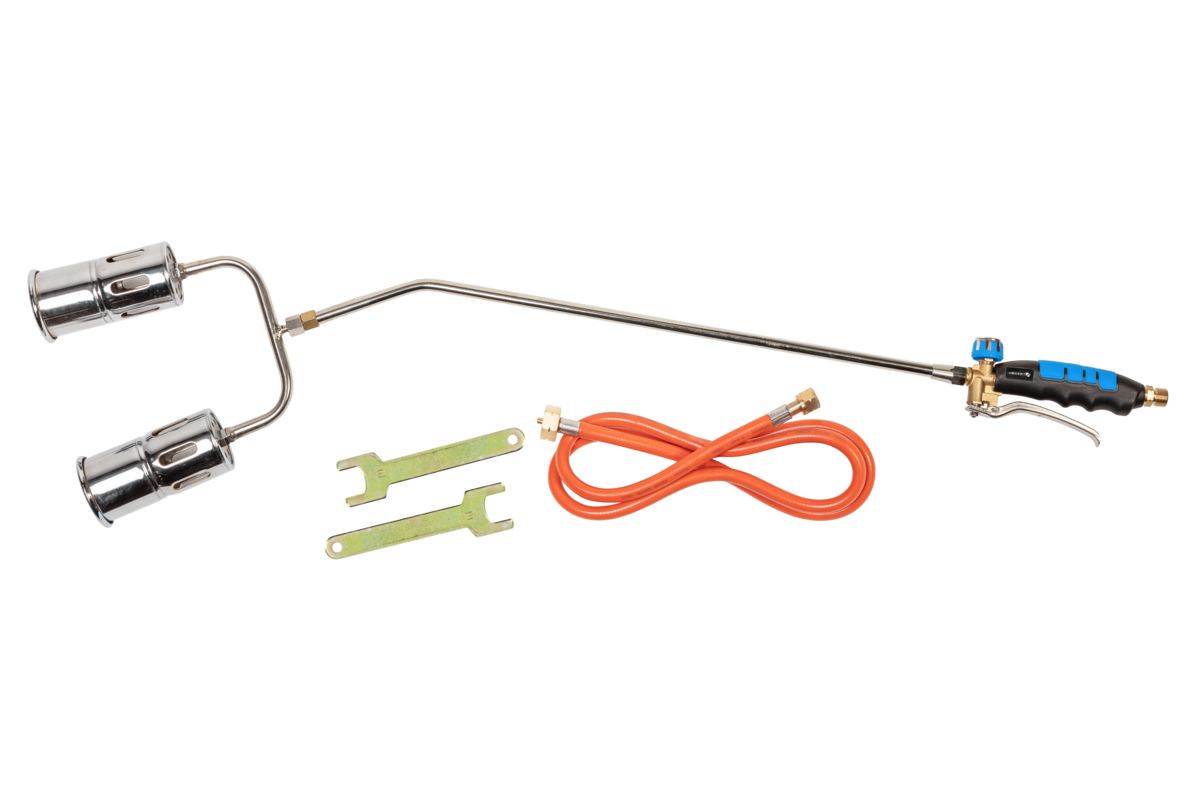 Professional set for gas soldering. The set includes two-nozzle gas burner, 5 m gas hose, and mounting wrenches. The soldering torch is equipped with a precise power regulator so that the soldering temperature can be adjusted to the type and size of the elements.