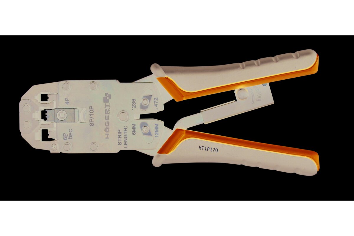 A crimping tool for RJ-11 terminals, used in installation and assembly work.Characteristics• made of high quality stainless steel• durable and deformation resistant• compatible terminals: 4P, 6P, 8P, 10P• integrated cutters• crimping force adjustment: guarantees that the tool opens once the connector is crimped• bi-material, anti-slip handles for a comfortable and secure grip