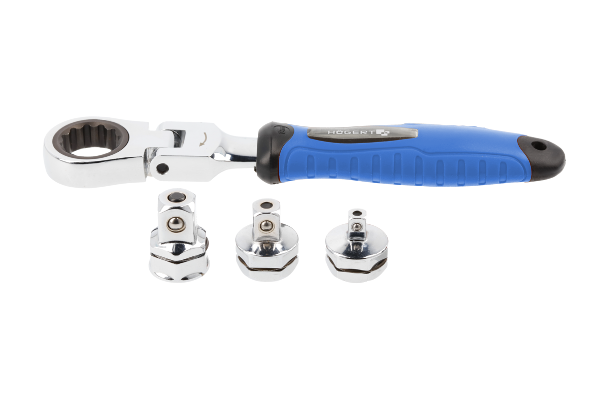A ratchet spanner with a joint is used to unscrew and tighten threaded joints ended with a hexagonal or dodecagonal fixing element. Thanks to the ratchet, there is no need to take the spanner off the nut to take another turn, whilst the adapters allow for work with sockets of various sizes. The universal application allows for its usage both in the workshop, as well as in renovation, construction and installation works.