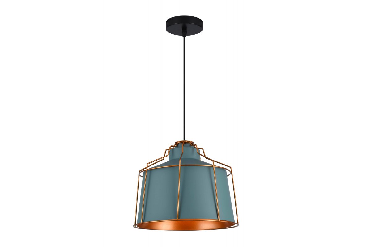 The effective design of this lamp is based on the principle of contrasts. A classic, slightly expanding downwards, turquoise lampshade is covered with a decorative golden frame.