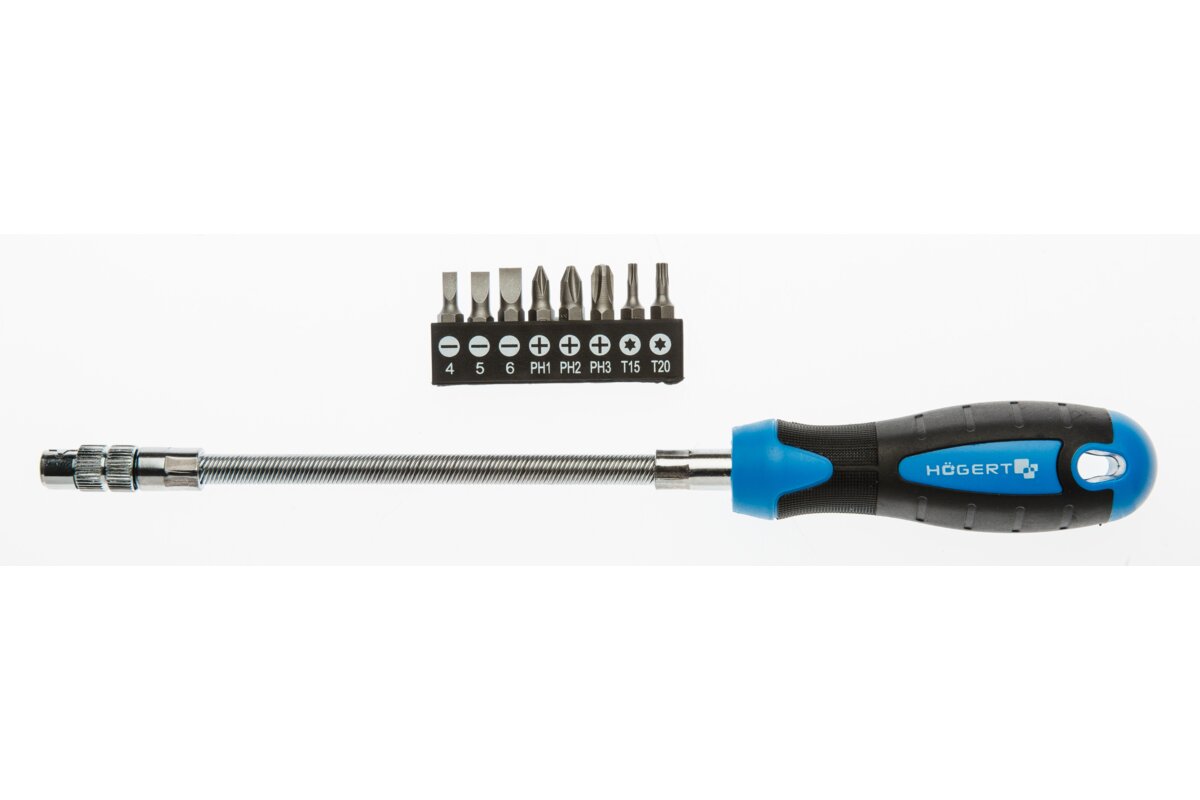 - product descriptiona screwdriver with a 215 mm flexible shaft and a set of bits: slotted bits 4.5 mm and 6 mm, ph1, ph2 and ph3 bits, as well as torx t15 and t20 bits. designed to bend around corners and get into hard-to-reach areas where a regular screwdriver cannot be handled.characteristics