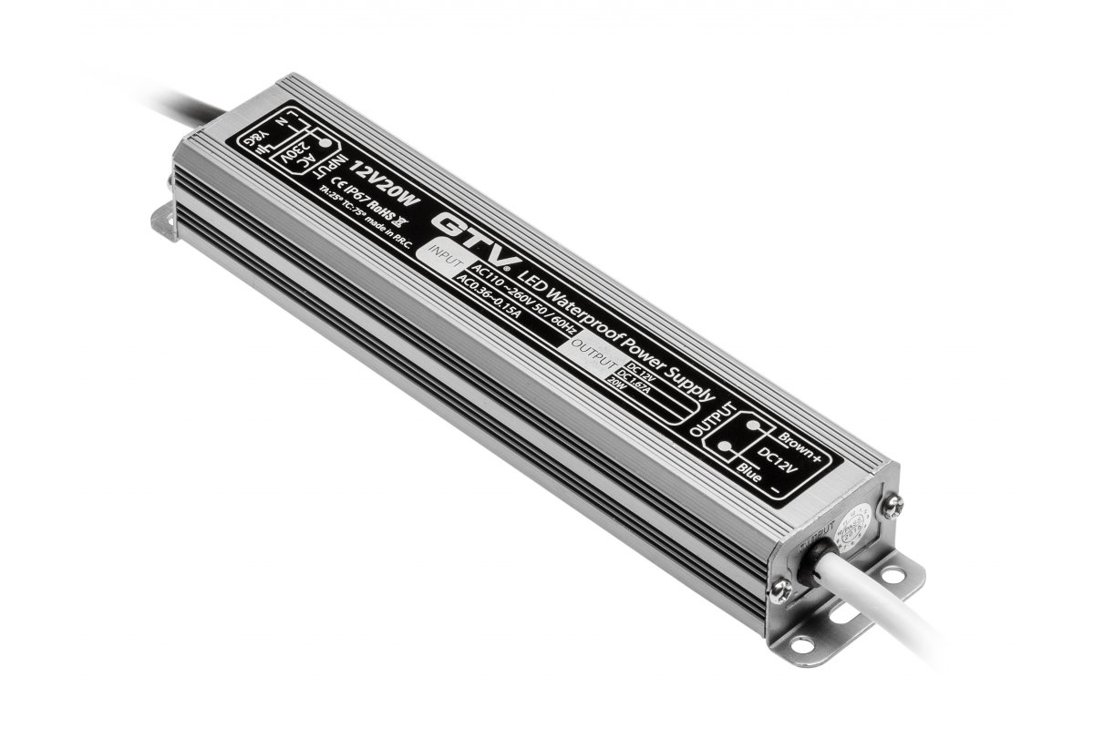 A LED driver reduces the input voltage of 220-230V to 12V. The casing of the LED driver has an IP67 rating, which means that it is resistant even to temporary immersion in water. The permissible external operating temperature range is between -20°C to +35°C.