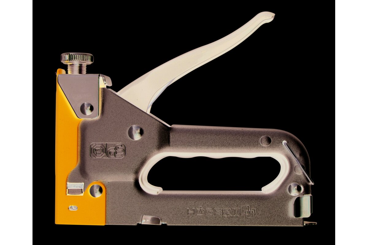 Staple gun for manual stapling. Designed for quick stapling of textiles to wood and wood base surfaces.